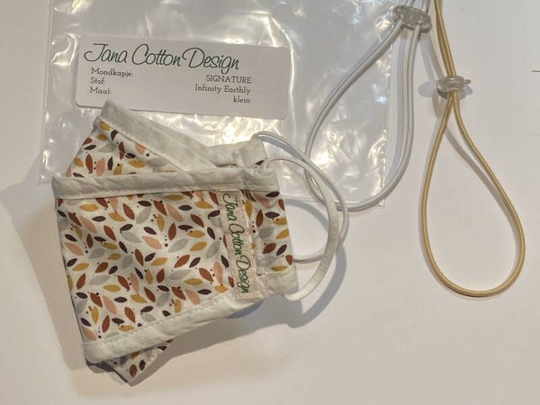 Signature Infinity Earthly: speels en aansprekelijk, trendy nazomer 2020. 100% katoen met oneindig veel bladachtige vormpjes en stippen in aardekleuren op een grijswitte ondergrond. Door de oker- en roze-kleuraccenten voegt Infitiny Earthly zich vriendelijk naar het gezicht. Matcht je outfit in wit, lichte kleuren en aardetinten.