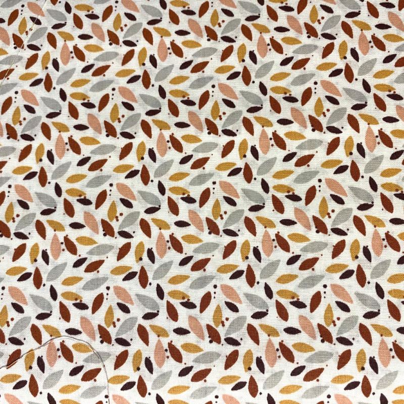 Speels en aansprekelijk, trendy nazomer 2020. 100% katoen met oneindig veel bladachtige vormpjes en stippen in aardekleuren op een grijswitte ondergrond. Door de oker- en roze-kleuraccenten voegt Infitiny Earthly zich vriendelijk naar het gezicht. Matcht je outfit in wit, lichte kleuren en aardetinten.